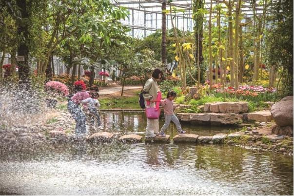 22日,南通绿博园温室馆,家长带着孩子穿过小池塘。 黄平华