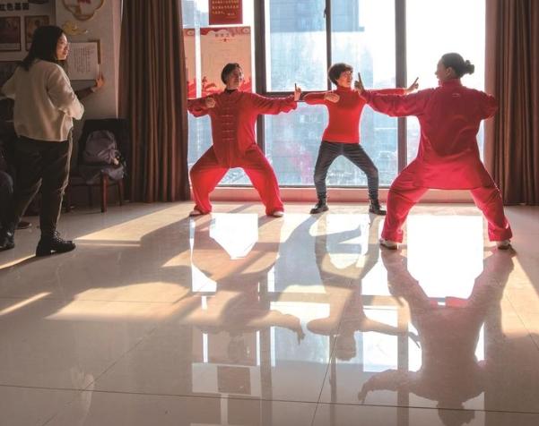 19日,海安高新区海安街道洋港社区举行八段锦功法讲座,学员们交流八段锦基本功法。 徐劲柏