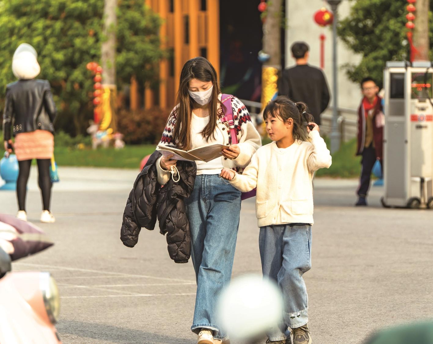 四月十五日,南通经济技术开发区星湖小学门前,家长接放学的孩子,边走边检查作业。 冯周鼎