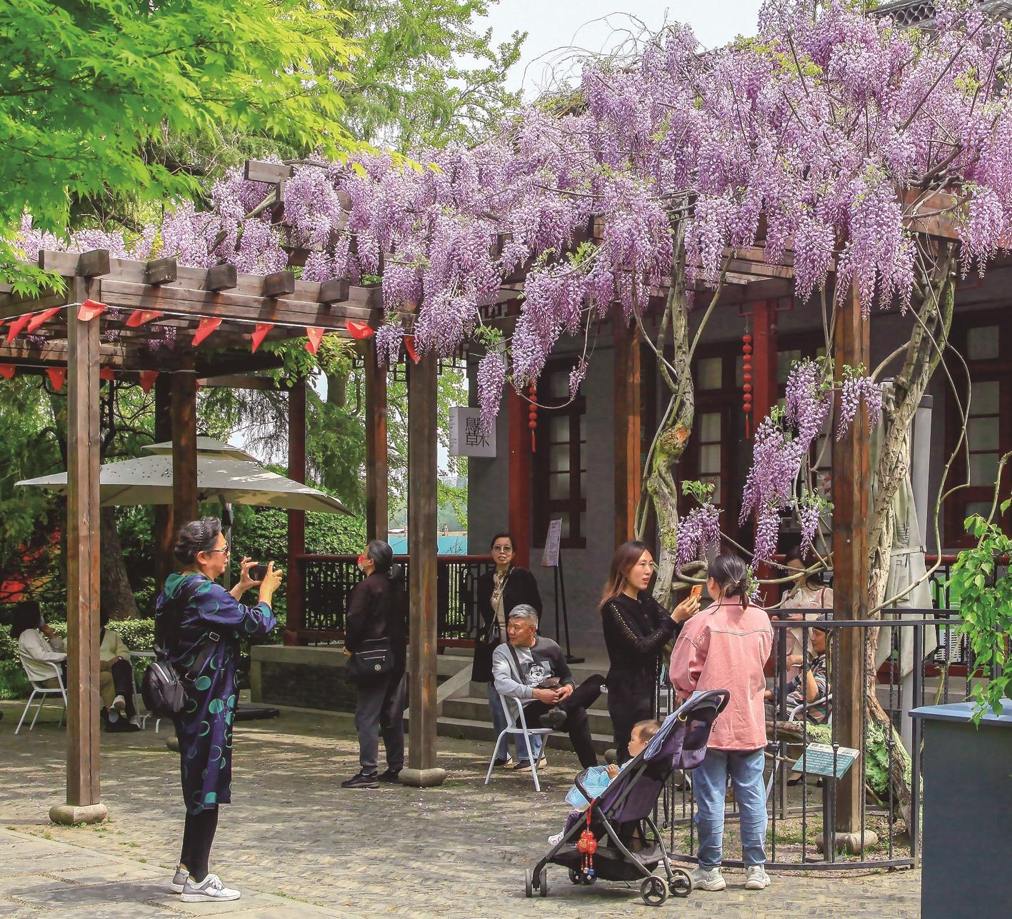 四月十六日,南通博物苑,一架紫藤花垂挂如云,游人络绎不绝,来此赏花打卡。孙镜福