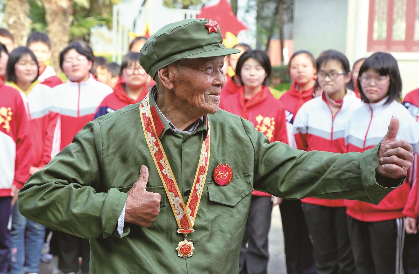 4月15日,海安市新四军联抗纪念馆,94岁革命老兵谢凤如给孩子们讲述当年战斗故事。 周强