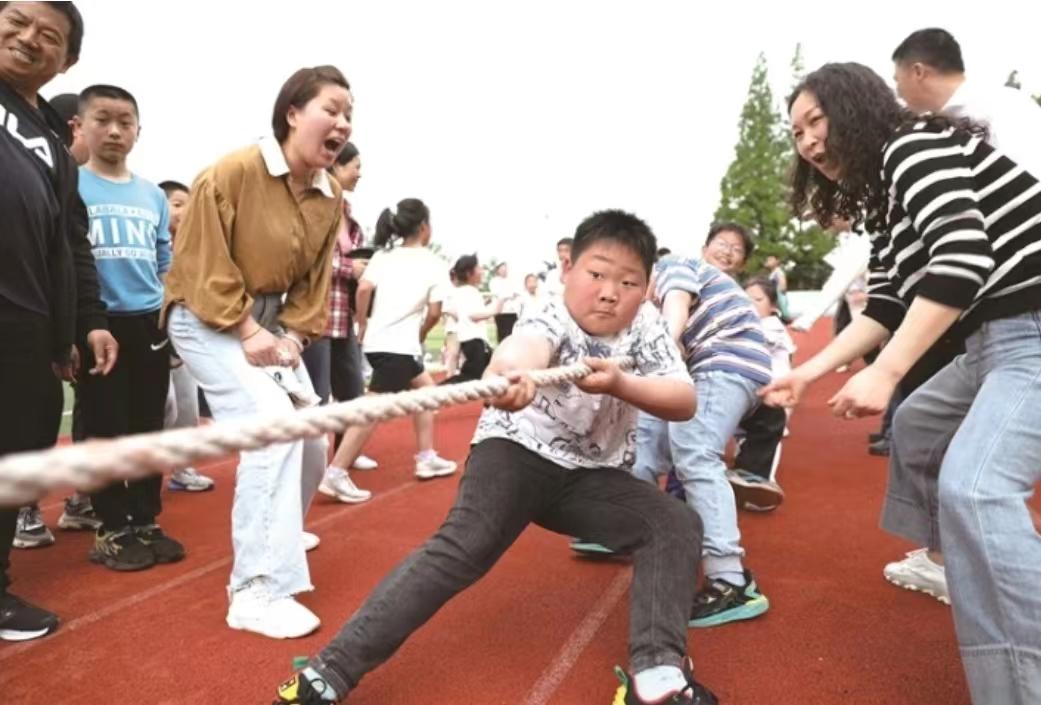 5月17日上午,海安高新区隆政中小学操场上,阳光体育运动会吸引了众多师生热情参与。拔河比赛现场,老师为学生加油,学生奋力争胜。潘晓军 程红梅