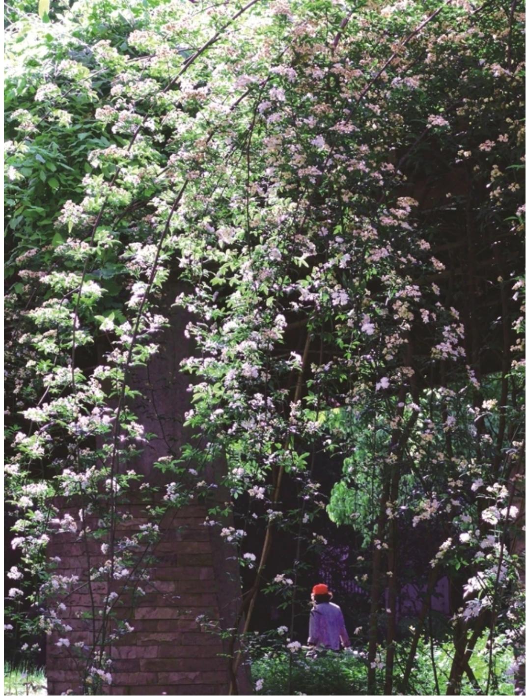 4月25日,崇川区一小区木香花盛开,一名保洁工人在花下劳作,让花更香、风景更美。 瞿德均