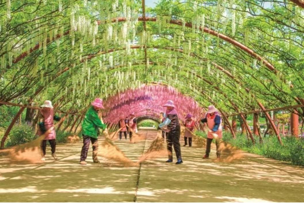 4月24日,洲际梦幻岛紫藤长廊,员工们清扫地面。 黄平华