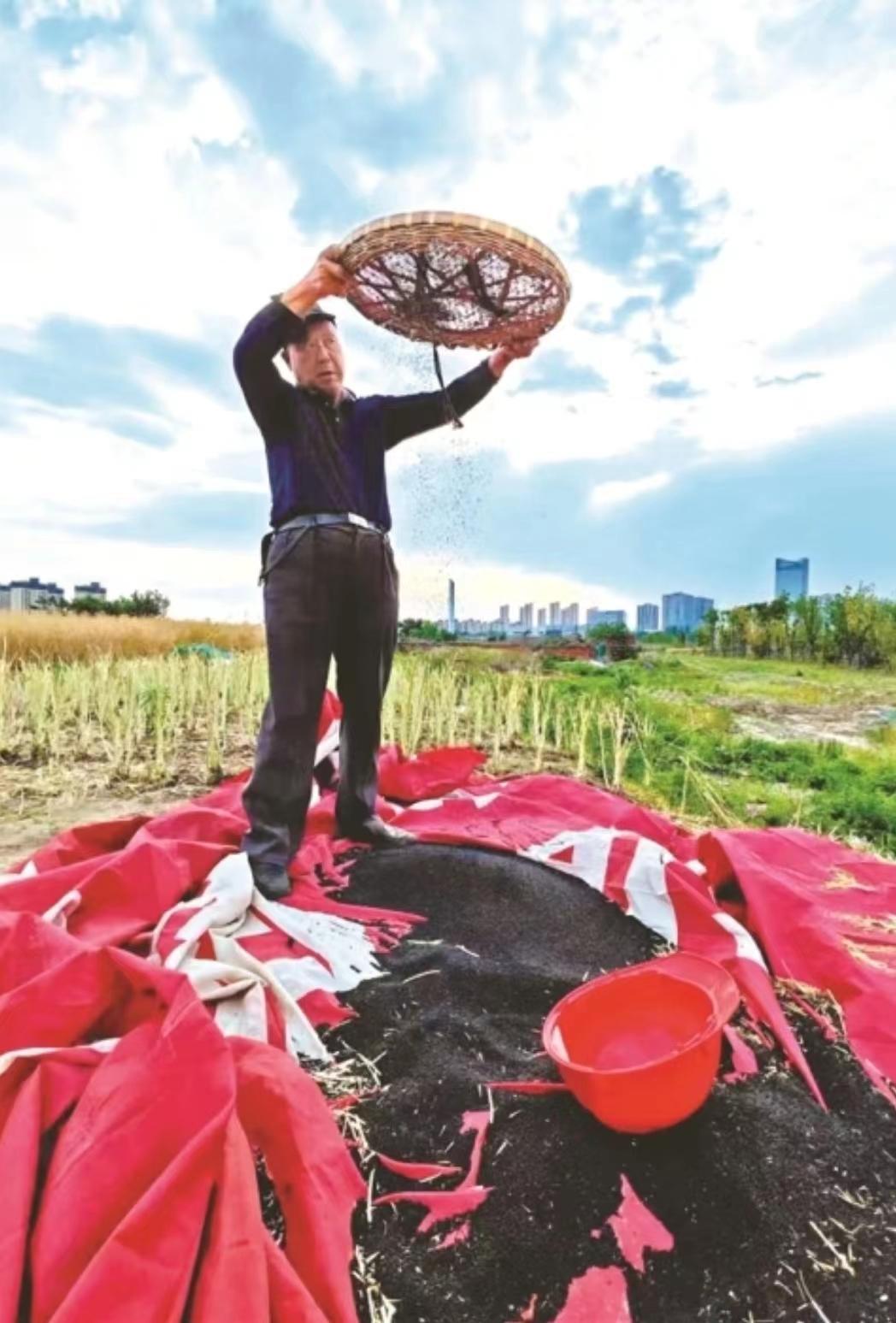 5月17日傍晚,崇川区钟秀街道百花村的退耕农民在待开发的闲置土地上收获油菜籽。 李斌