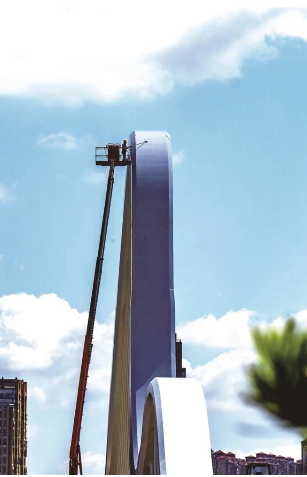 5月8日,市区五水商圈附近一座新建大桥上,工人登高进行涂刷作业。 陈鲁明