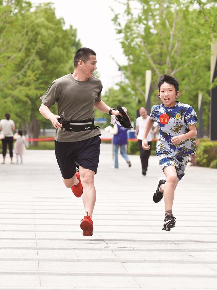 5月25日,南通经济技术开发区举行庆祝建区40周年双拥欢乐跑。比赛中,两名家庭组成员奋力奔跑。赵国庆