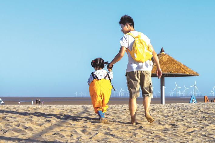 5月19日,启东市十里海湾,男子领着孩子行走在海边沙滩上。黄是春