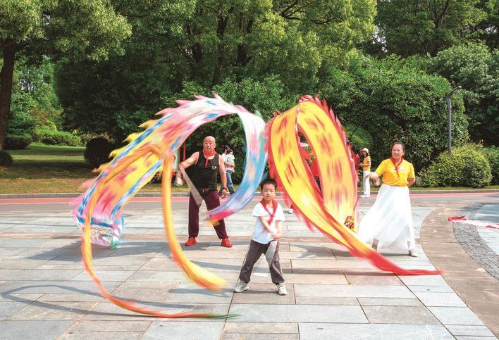 6月1日,南通经济技术开发区能达中央公园,爷爷奶奶带着孩子舞龙。黄平华