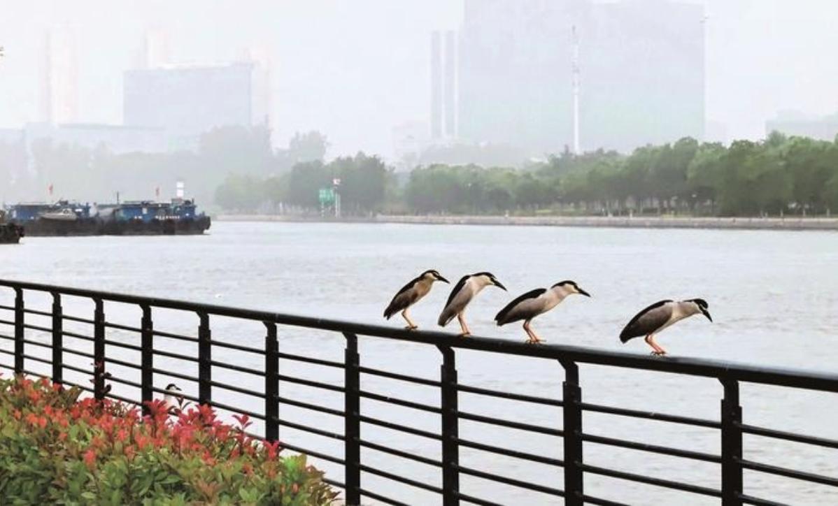 6月13日,市区通吕运河南岸,夜鹭在河畔栏杆上站成一排。瞿德均