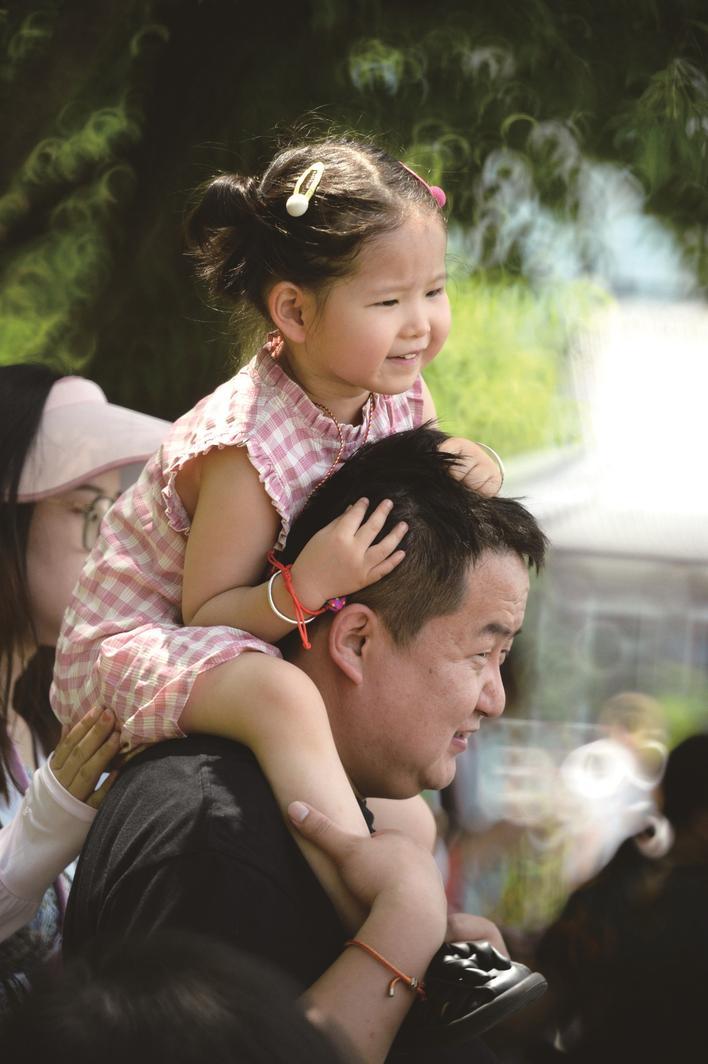 6月10日,濠河边,小女孩骑坐在家长肩头观看端午龙舟赛。陆小平