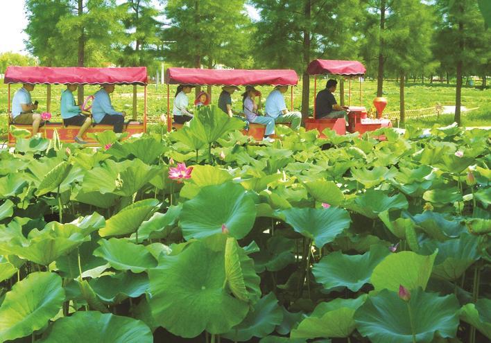 6月10日,如皋平园池村,游客们乘坐小火车游览荷园。 谢承祖