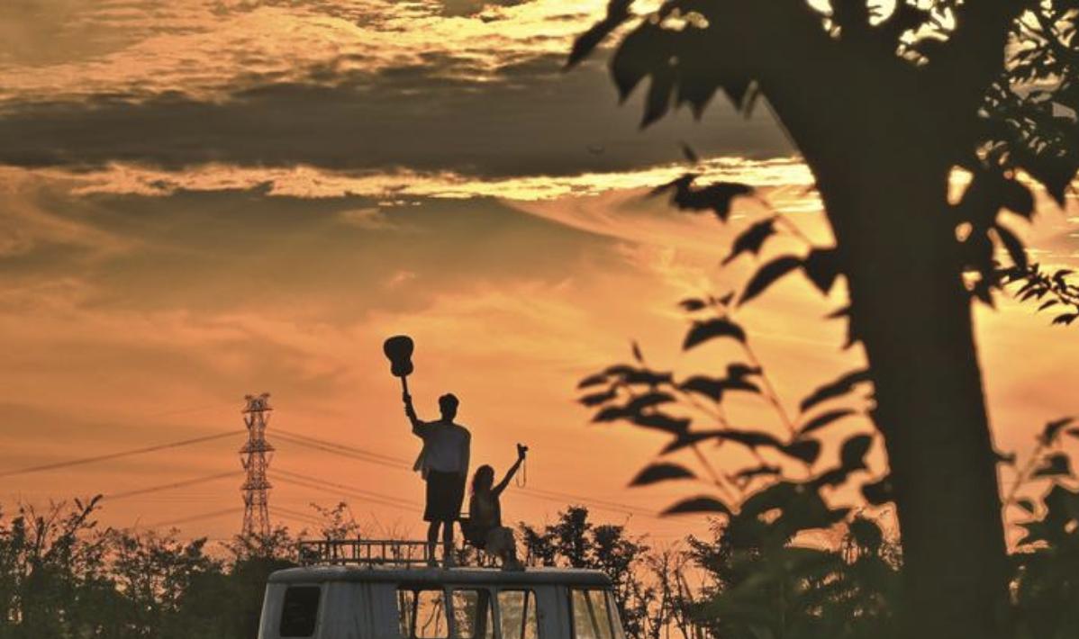 6月2日傍晚,南通都市农业公园,一对情侣以漫天晚霞为背景拍照留念。蒋红霞