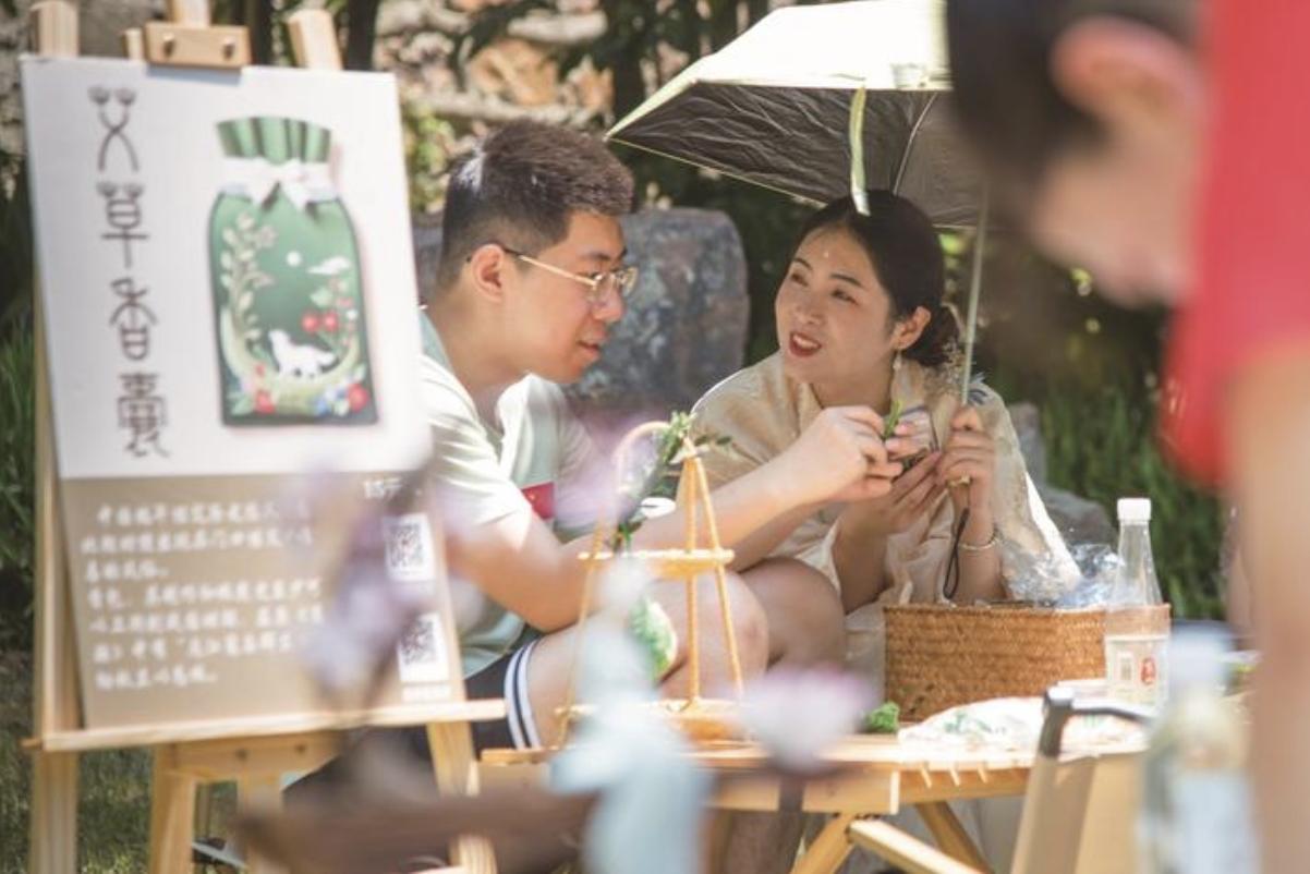6月9日,一个民间团队在狼山景区进行迎端午艾草香囊制作演示。 黄平华