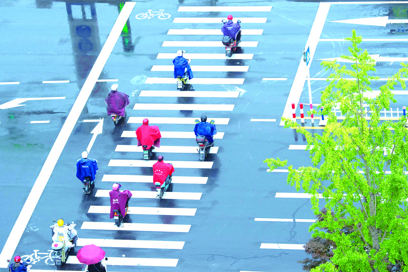 6月21日,海安市街头,人们在雨中骑行通过斑马线,恰似跃动的音符。徐劲柏
