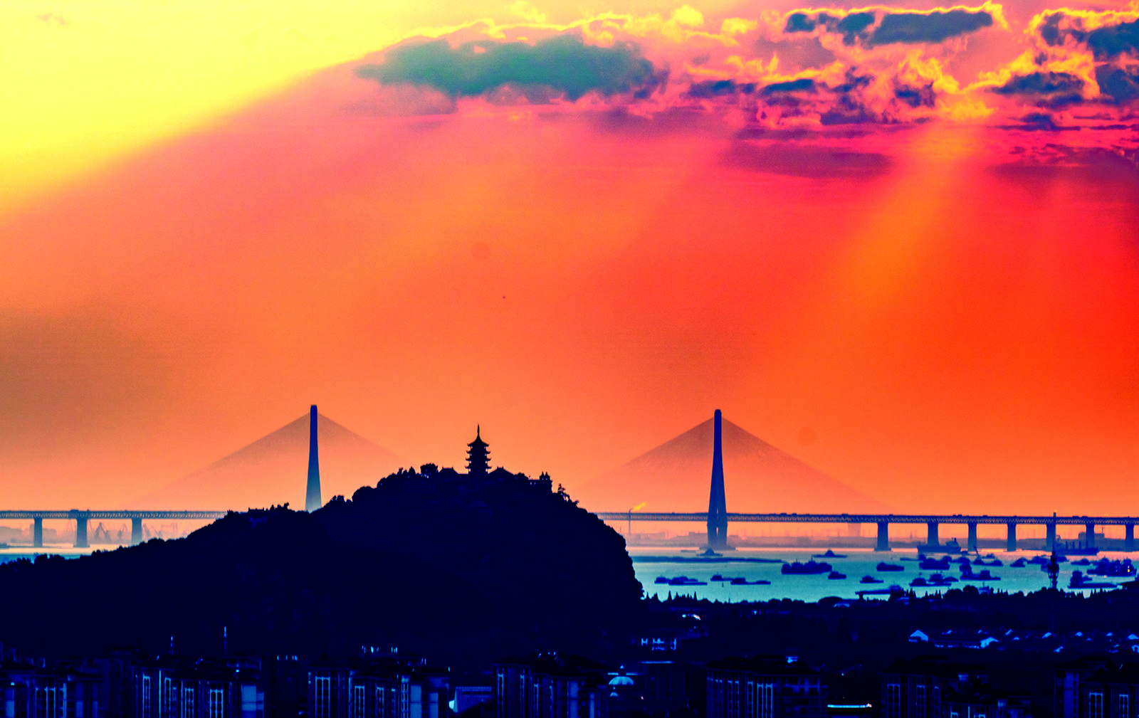 6月6日傍晚,霞光从云中泻下,光芒万丈,狼山、沪通长江公铁大桥形成美丽的剪影。冯周鼎