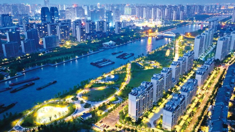 6月20日,无人机拍摄的通吕运河城闸大桥至通宁大桥段两岸华灯初上,景色醉人。李斌