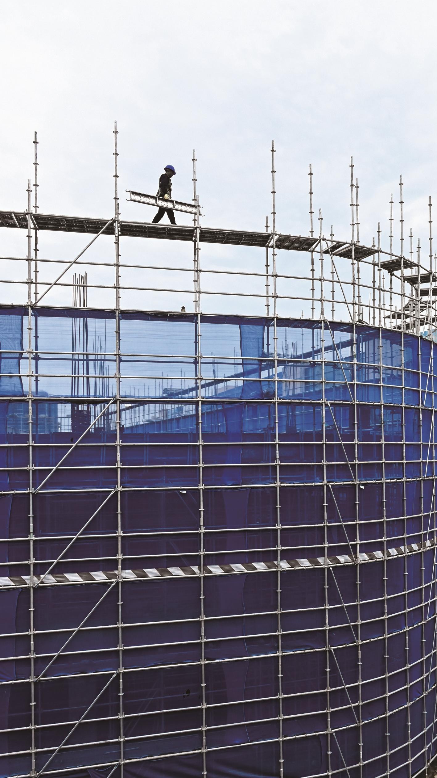 7月17日,南通叠石桥家纺城四期工程工地,一名建筑工人从高高的脚手架上走过。 王培中
