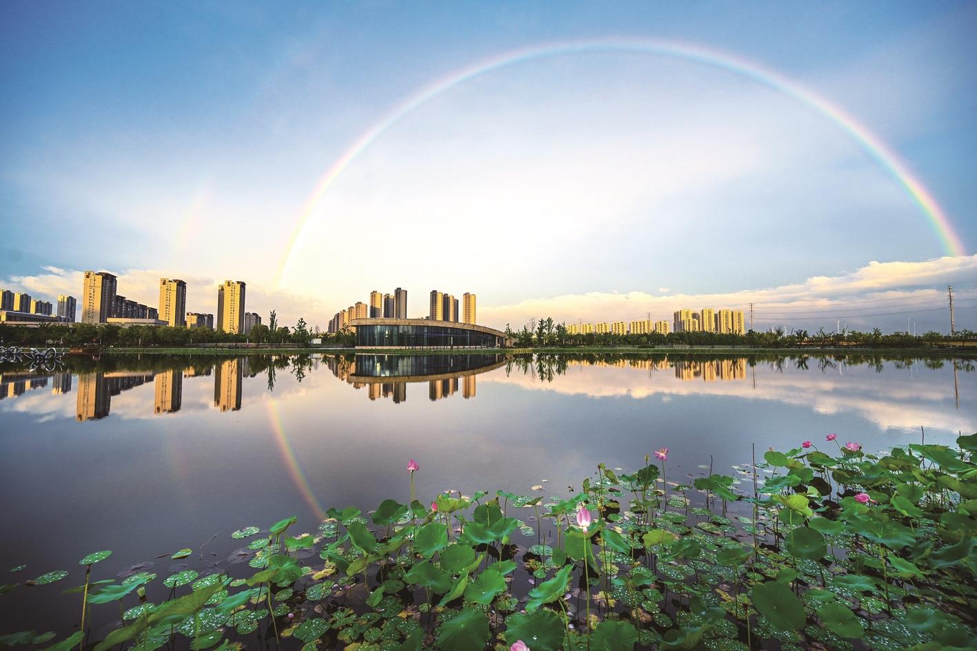 六月三十日傍晚,雨过天晴,海门区府南绿廊,一道彩虹横跨天际。 施宏慧