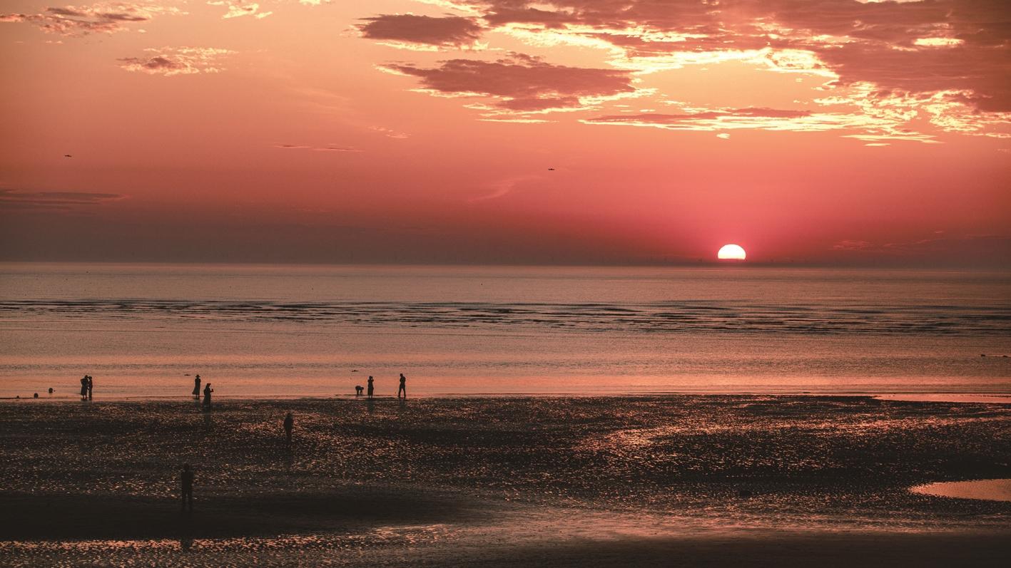 七月五日清晨,一轮朝阳跃出海面,启东月亮湾海滩上的游人沐浴在霞光里。张柳