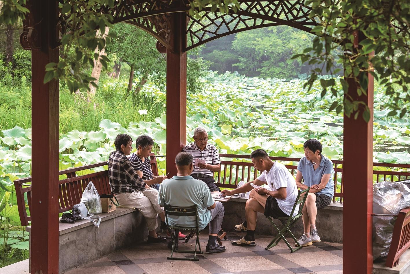 七月十五日,天气炎热,大爷大妈们在唐闸公园荷花池凉亭内纳凉、掼蛋,避暑娱乐两不误。 袁德君
