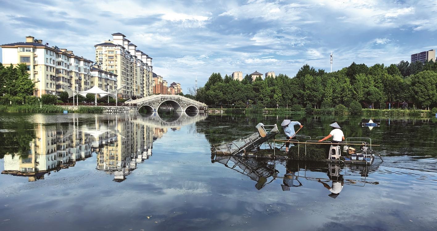 7月19日,如东县浅水湾公园。炎炎夏日,河道清洁工人正在清理水草,为市民提供一个水清、岸绿、景美的休闲场所。顾华