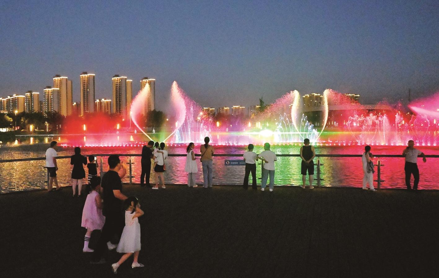 7月30日,海门区府南绿廊,夜色里音乐喷泉如梦似幻,吸引众多纳凉市民观赏。施宏慧