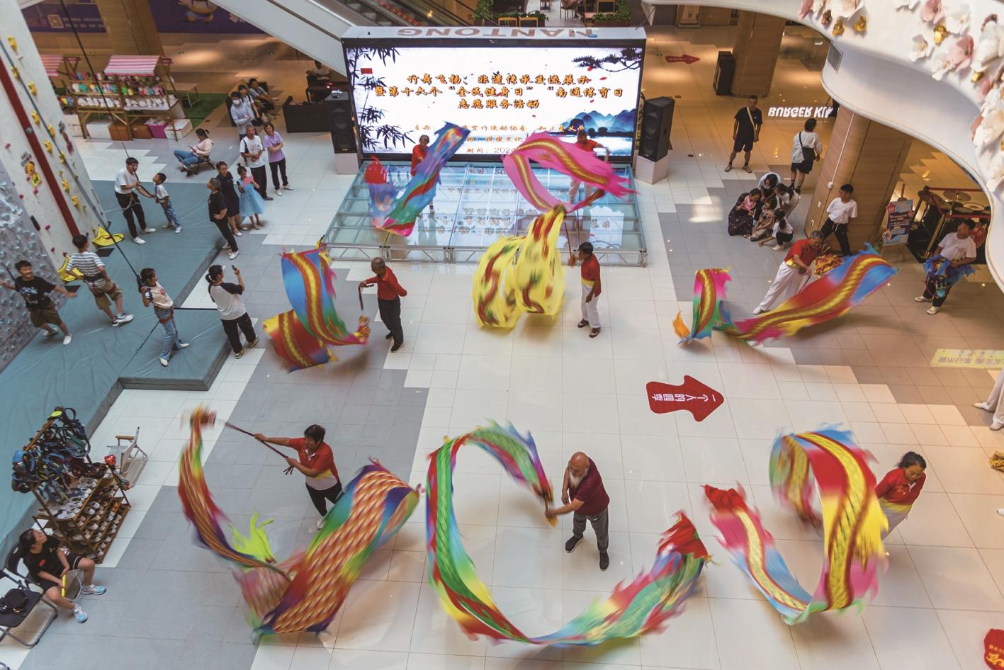 8月7日,南通凤凰广场,市空竹运动协会进行集体舞龙表演。 黄平华