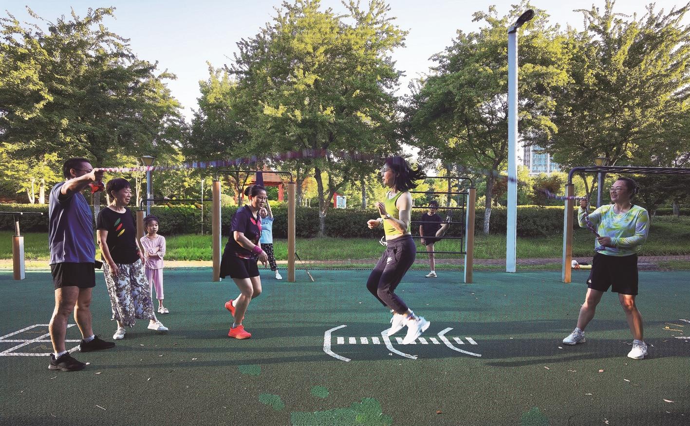7月29日晨,通州南山湖运动场,一群欢乐晨练人在跳绳。卞国成