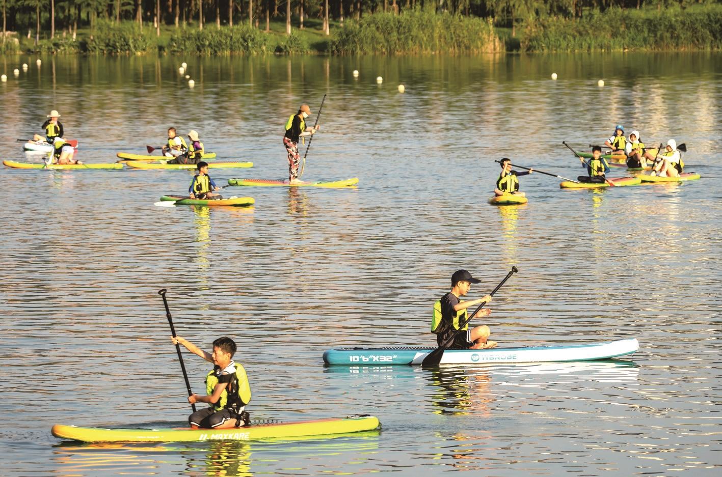 7月21日,南通经济技术开发区能达生态通廊,孩子们驾着皮划艇在水面上纵横往来。 冯周鼎