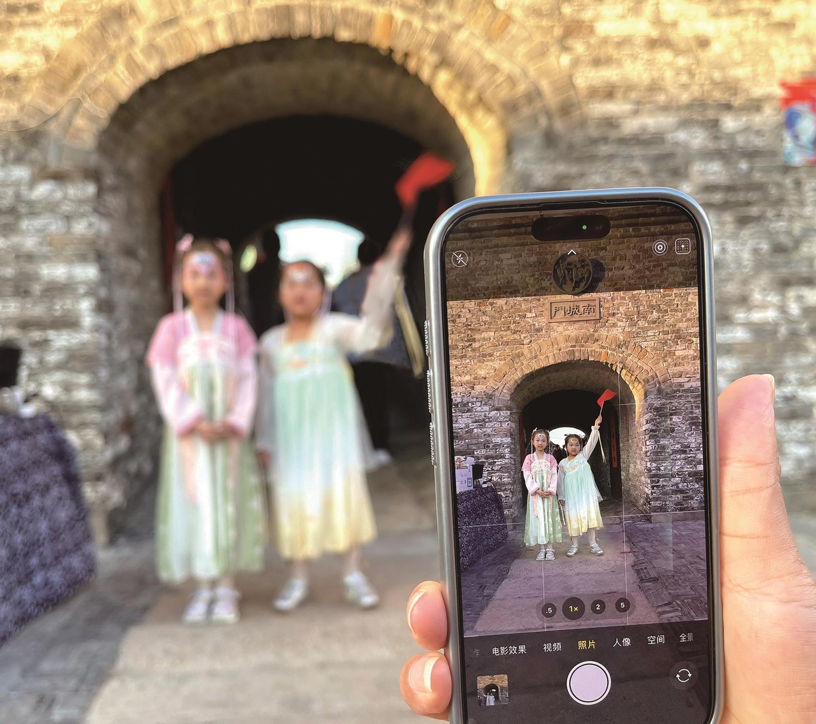 10月3日,两名小游客在海门区余东古镇南城门前拍照留影。施敏