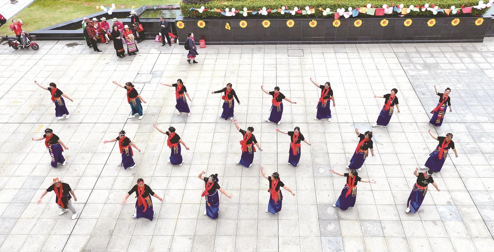 10月1日, 海安文化艺术中心广场,人们身着节日盛装、脸贴爱心贴,在音乐伴奏下,喜跳民族团结锅庄舞,欢度国庆。顾华夏
