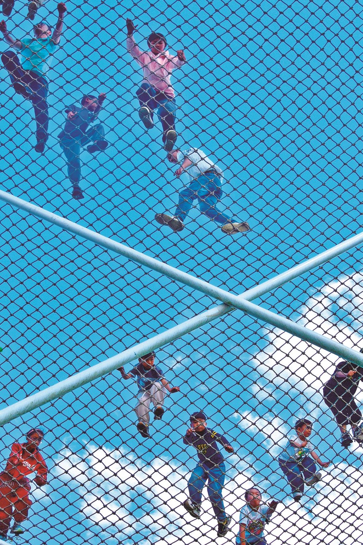 10月4日,如皋市如城街道顾庄社区 “大风车乐园”内,众多小朋友体验攀爬软梯。吴树建