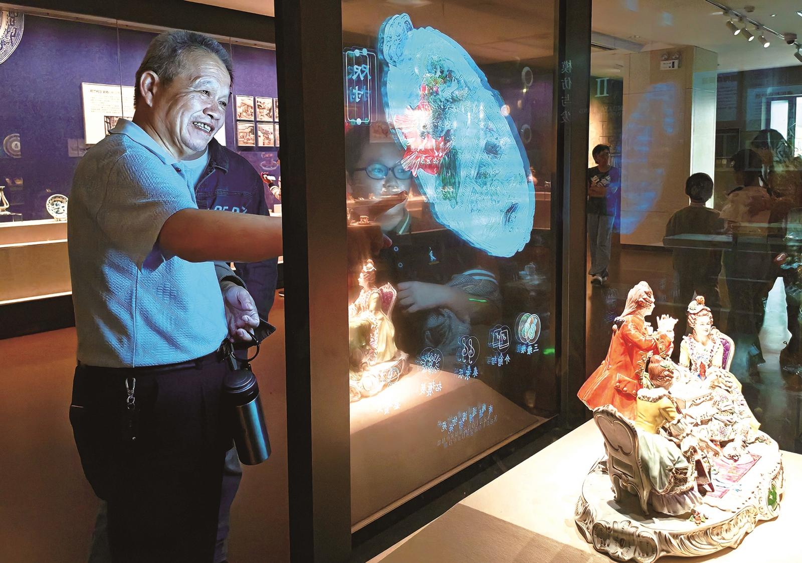 10月4日,众多市民和游客来到南通博物苑参观上海市历史博物馆馆藏欧洲瓷器展。触摸式屏幕让观众既能放大瓷器文字说明,又可观看放大的瓷器细节,让老年和少年观众流连忘返。李斌