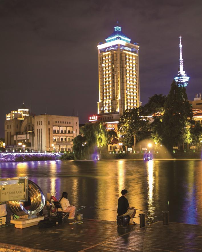 9月3日,市区濠河边,市民在璀璨夜色里垂钓。袁建