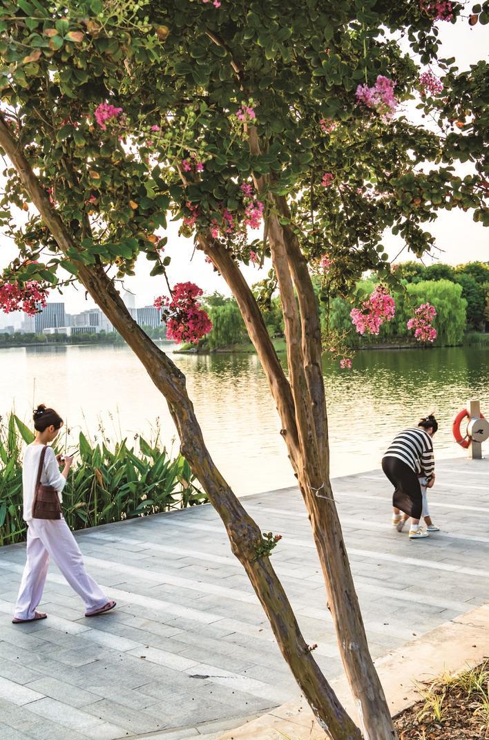 9月6日,中创区紫琅湖公园,市民徜徉在紫薇飘香的紫琅湖畔。冯周鼎