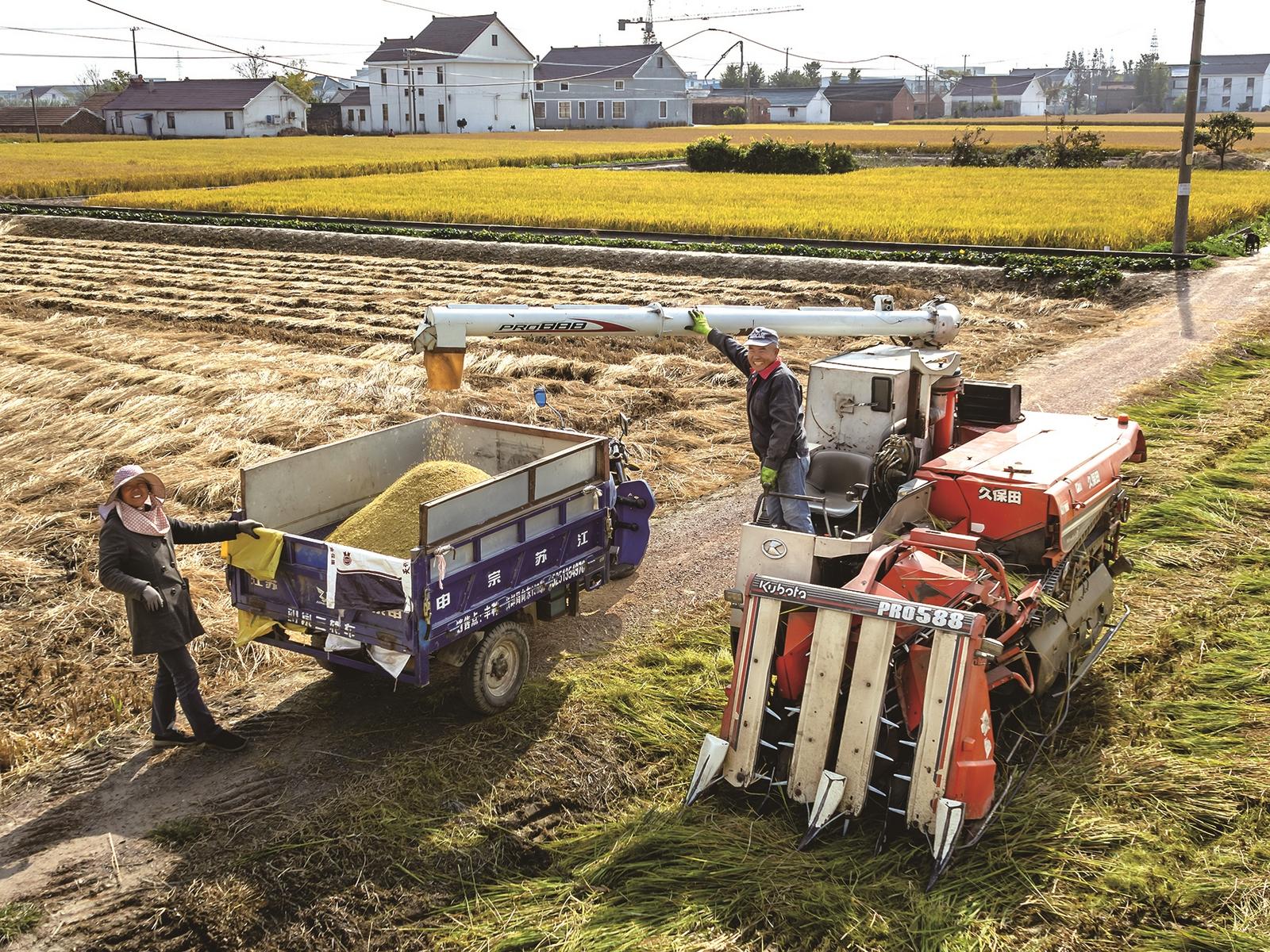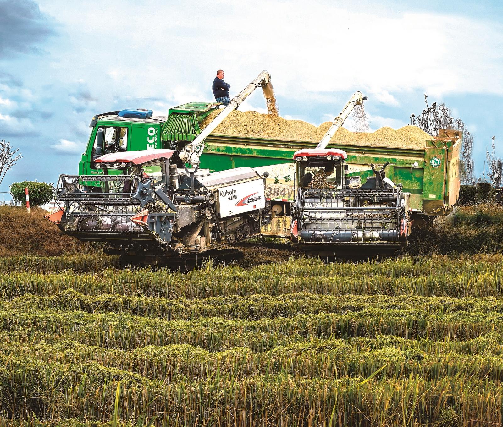 11月9日,通州区金沙街道万顷良田,两台收割机结束收割往运粮卡车输送稻谷。邱训锦