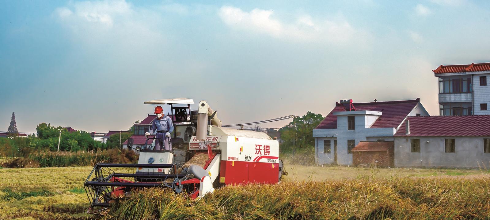 11月13日,天空湛蓝,通州区西亭镇,农家屋舍后的田野里,收割机正在收割水稻,风中飘散阵阵稻香。 蒋红霞