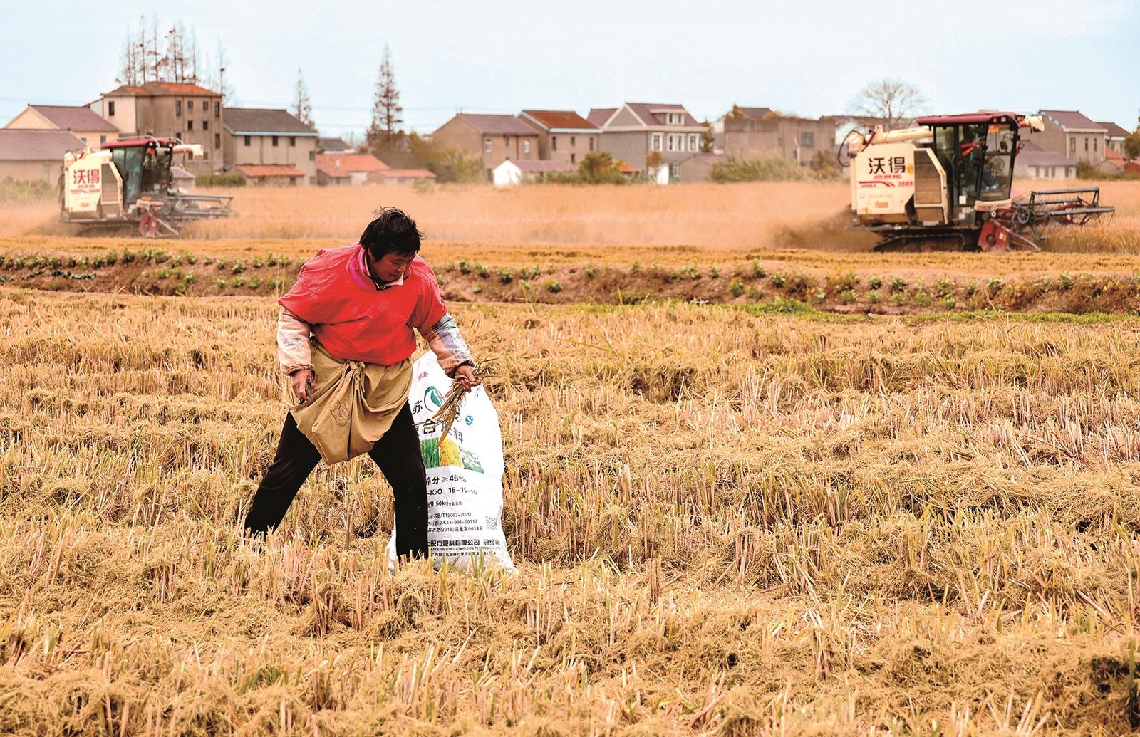 11月19日,海门区悦来镇阳东村,远处两台收割机驰骋在金色的田野上,近处一名村民在捡拾稻田里遗落的谷穗,力争颗粒归仓。褚晓萍