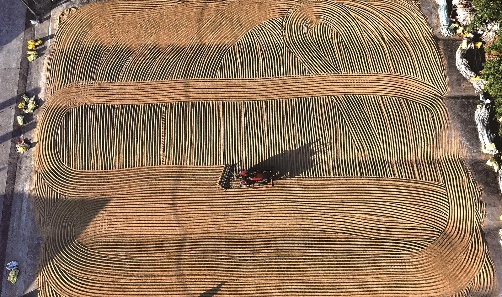 10月30日,国营海安农场天鹅村,农民趁着晴好天气翻晒稻谷,翻耙机械在晒谷场上“画”出规则的图案。顾华夏