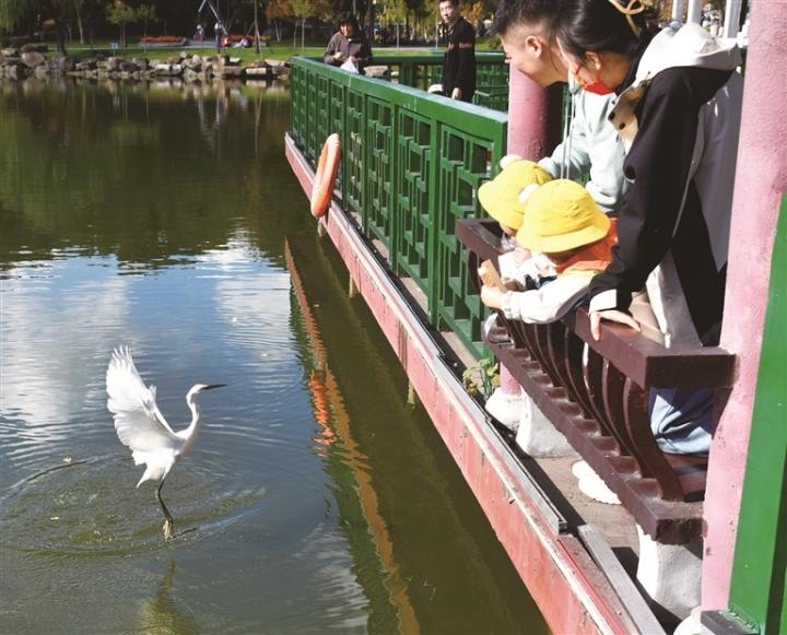 11月23日,周末,海门区东洲公园,游客与白鹭和谐互动。施敏