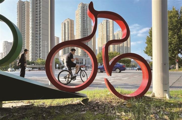 10月24日,海门区长江路边“骑行者”城市雕塑,一个骑行者正好框在雕塑的车轮中,趣味横生。夏至未至