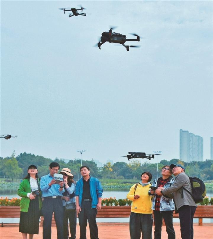 10月12日,如皋市龙游河生态公园,摄影爱好者们在体验无人机航拍。吴树建