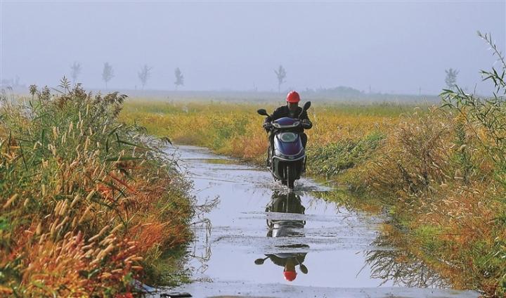 11月3日清晨,薄雾中,海门区城郊,一名市民骑着电动车穿过秋日的田野。施宏慧