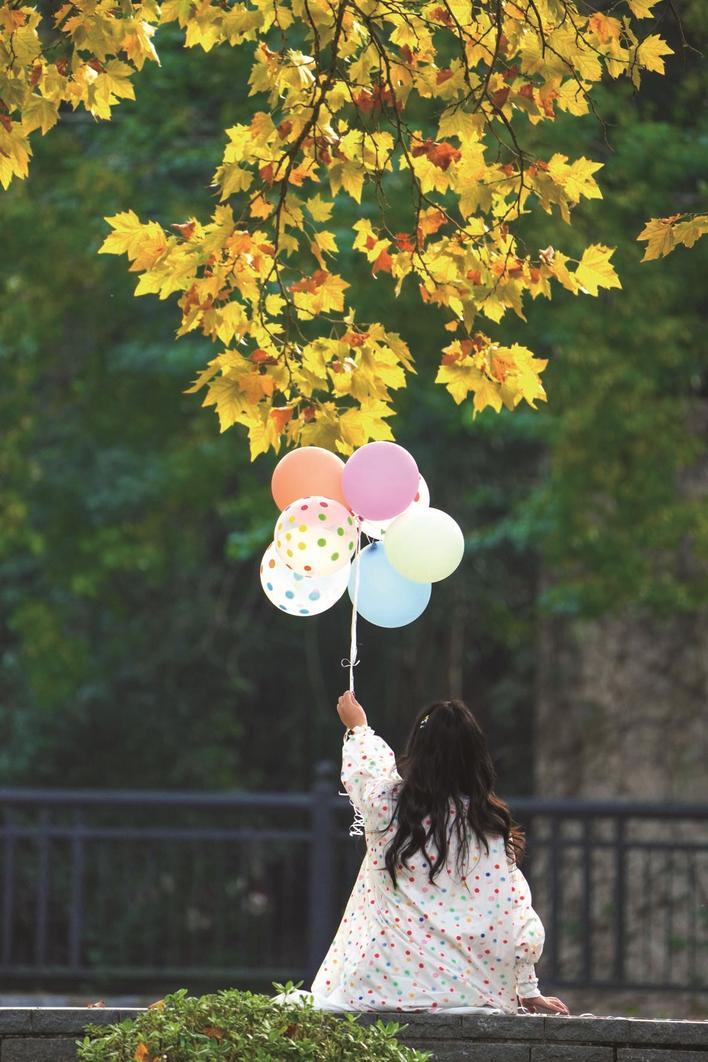 11月12日,南通博物苑,一个小女孩让一束五彩气球飘向高处与金色的树叶相触。袁建