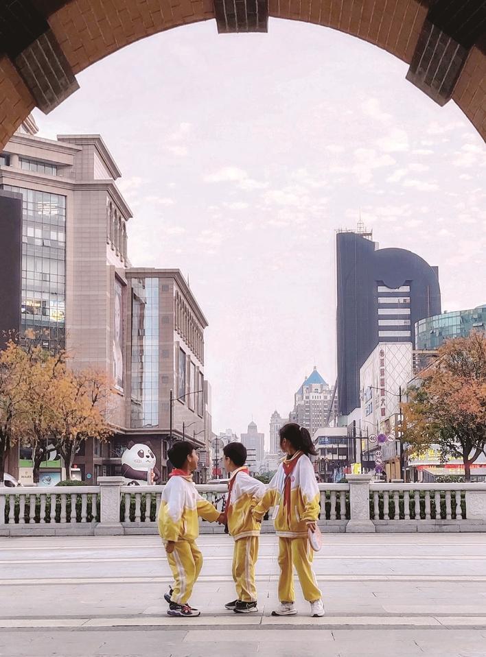 11月10日,三个孩子在钟楼大门前嬉戏,画面的背景是通城南大街。任鹰