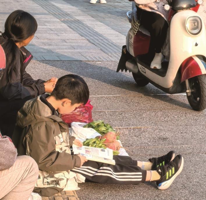 11月3日,市区街边,一个小朋友坐在家长的路边摊旁看书学习。瞿德均