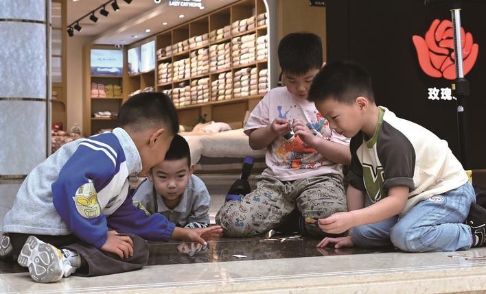 10月20日,海门叠石桥家纺城,四个小男孩在玩拍纸片游戏。王培中