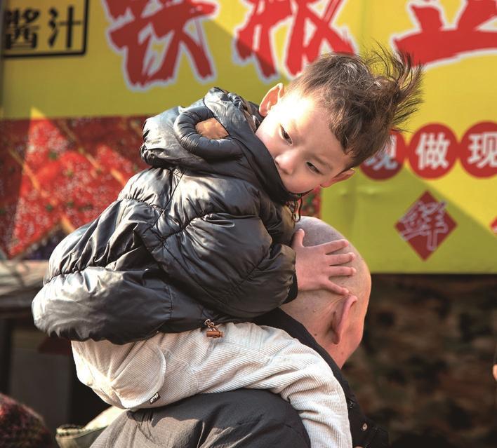 12月18日,刘桥新联庙会上,骑在家长肩头逛庙会的孩子四处张望。平平