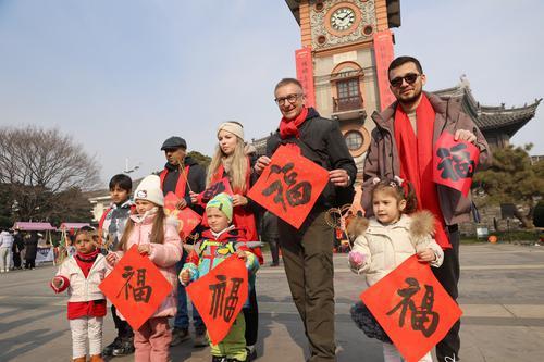 现场浓浓年味也让在南通生活的外国友人,感受到中国春节的喜庆氛围。美丽的通城,热情好客的南通人,让他们深深地爱上了这座城市。揭联仪式后,来自西班牙、俄罗斯、乌兹别克斯坦、巴基斯坦、摩洛哥等国家的10多位外国友人还跟随4位书法家现场学写“福”字,即席挥毫,让市民们把“福”带回家。